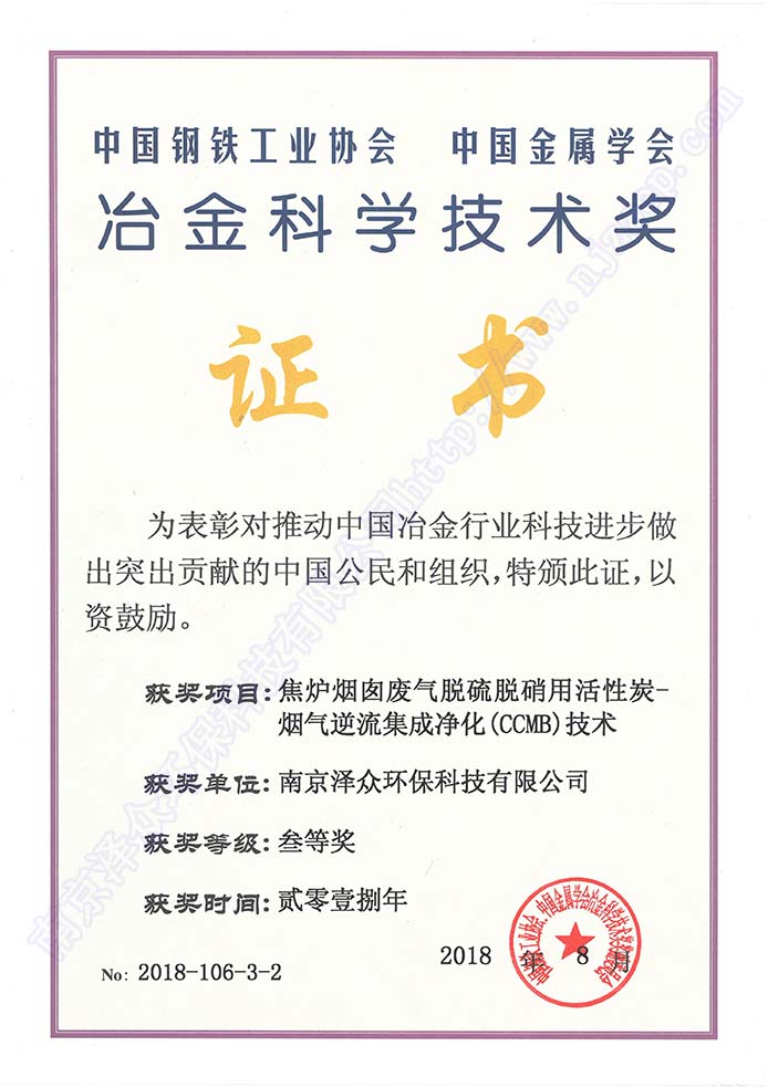 南京澤眾環(huán)??萍加邢薰咀溆谀暇┦杏昊ㄅ_(tái)區(qū),注冊(cè)資本6000萬(wàn)元,2017年被認(rèn)定為高新技術(shù)企業(yè),2018年被認(rèn)定為瞪羚企業(yè),入選中國(guó)鋼鐵技術(shù)與服務(wù)供應(yīng)商品牌企業(yè),被評(píng)為鋼鐵產(chǎn)業(yè)鏈綠色標(biāo)桿企業(yè),與浙江工業(yè)大學(xué)合作成立聯(lián)合研發(fā)中心,入股河南安鋼澤眾冶金設(shè)計(jì)有限責(zé)任公司,牽頭起草《燒結(jié)煙氣活性焦干法脫硫、脫硝技術(shù)規(guī)范》和《焦?fàn)t煙氣聯(lián)合脫硫脫硝技術(shù)規(guī)范》。 公司專(zhuān)長(zhǎng)于活性炭煙氣凈化技術(shù),創(chuàng)新能力突出,成功研發(fā)具有獨(dú)立自主知識(shí)產(chǎn)權(quán)的活性炭-煙氣逆流集成凈化CCMB(ActivatedCarbon Countercurrent Moving Bed)技術(shù),形成獨(dú)立自主知識(shí)產(chǎn)權(quán)體系,由中國(guó)金屬學(xué)會(huì)評(píng)價(jià)鑒定達(dá)到國(guó)際領(lǐng)先水平,獲得冶金科技三等獎(jiǎng),被評(píng)為“鋼鐵產(chǎn)業(yè)鏈綠色低碳好技術(shù)”,入選中國(guó)鋼鐵工業(yè)協(xié)會(huì)先進(jìn)節(jié)能環(huán)保技術(shù),入選生態(tài)環(huán)境部國(guó)家先進(jìn)污染防治技術(shù)目錄推廣技術(shù)。